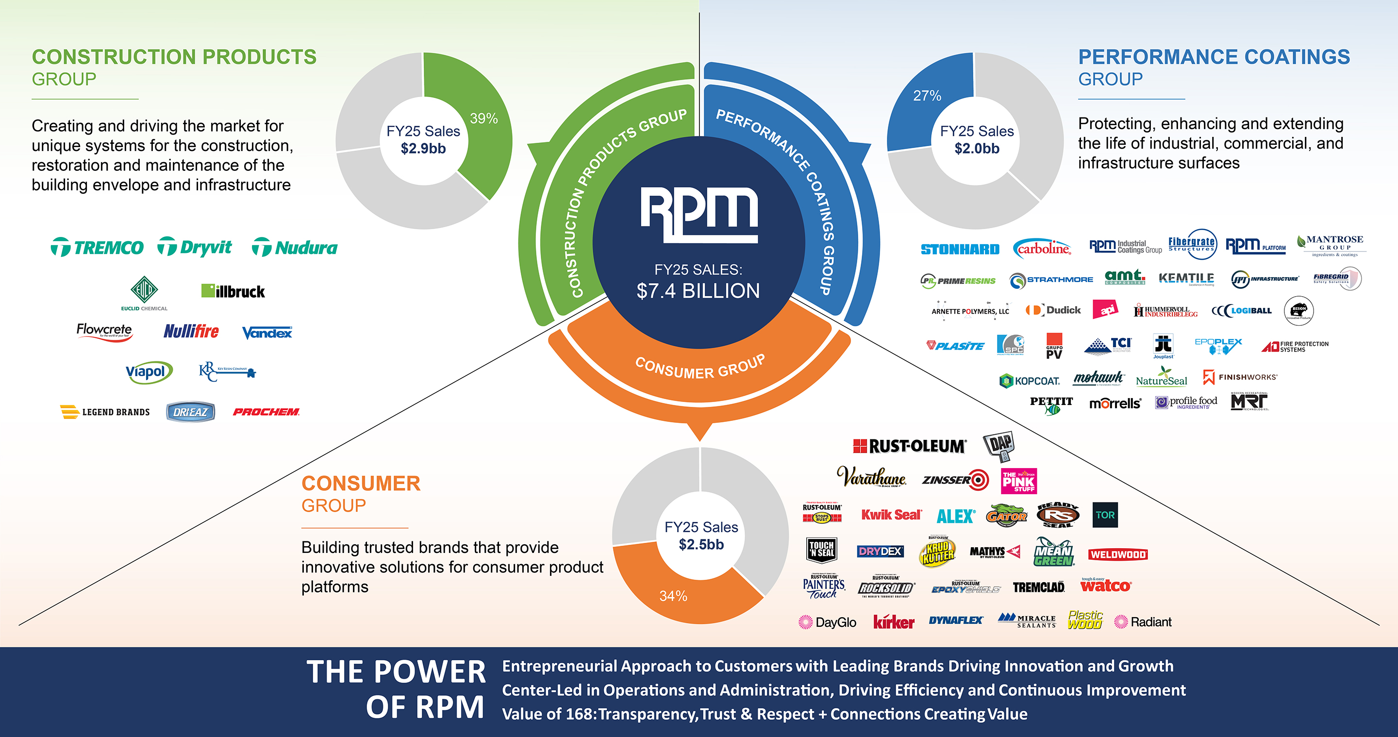 RPM boasts a diverse portfolio with hundreds of brand-name products, many of which hold the leadership position for market share and sales in the markets they serve. From homes and workplaces, to infrastructure and precious landmarks, these leading brands are trusted by consumers and professionals around the world to beautify, improve and protect.